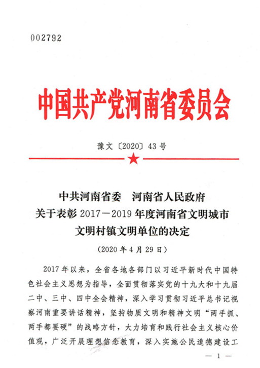 日前,中共河南省委、河南省人民政府印發(fā)《關(guān)于表彰2017-2019年度河南省文明城市文明村鎮(zhèn)文明單位的決定》(豫文〔2020〕43號),公司省級文明單位屆滿到期后再次申報成功,連續(xù)第五次榮膺"河南省文明單位"榮譽稱號。