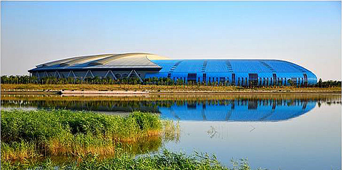 項(xiàng)目位于黃河入??谏綎|省東營(yíng)市,右半部屋蓋采用了跨度148米的張弦焊接球節(jié)點(diǎn)抽空四角錐網(wǎng)架結(jié)構(gòu),為國(guó)內(nèi)跨度最大的張弦網(wǎng)架結(jié)構(gòu)建筑。