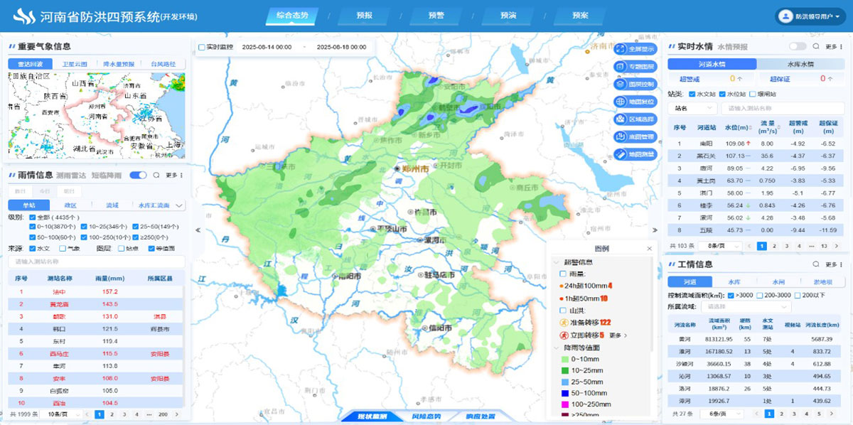 聚焦防汛核心業(yè)務(wù),建設(shè)綜合態(tài)勢(shì)、預(yù)報(bào)、預(yù)判、預(yù)警、預(yù)演、預(yù)案模塊,全面支撐從“雨水情監(jiān)測(cè)預(yù)報(bào)-風(fēng)險(xiǎn)精準(zhǔn)定位-影響綜合研判-科學(xué)調(diào)度處置”的全鏈條防汛業(yè)務(wù)決策體系,實(shí)現(xiàn)洪水預(yù)報(bào)調(diào)度在數(shù)字場(chǎng)景中的動(dòng)態(tài)交互、實(shí)時(shí)融合和仿真模擬,推動(dòng)已建項(xiàng)目統(tǒng)一管理,在建項(xiàng)目統(tǒng)一標(biāo)準(zhǔn),規(guī)劃項(xiàng)目統(tǒng)一框架,實(shí)現(xiàn)河南全省數(shù)字孿生水利業(yè)務(wù)全鏈接,為各流域水利工程安全運(yùn)行和優(yōu)化調(diào)度提供超前、快速、精準(zhǔn)的決策支持,全面提升全省防汛工作的整體效能與決策水平。