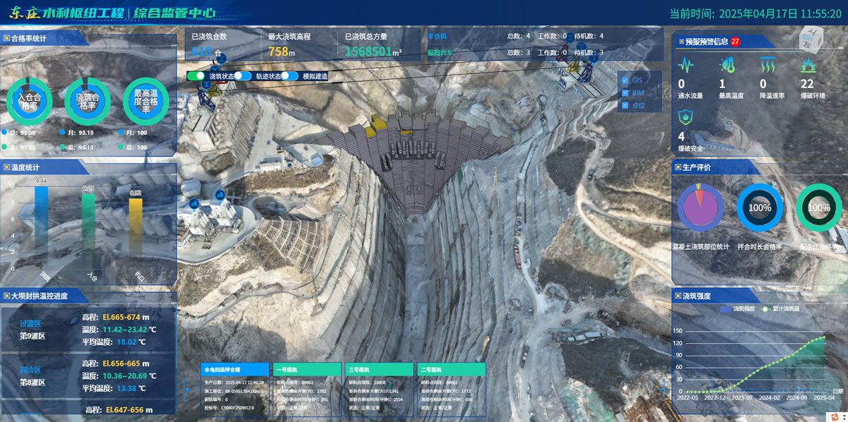 東莊水利樞紐信息化建設(shè)主要圍繞大壩主體工程澆筑應(yīng)用場(chǎng)景,基于大壩1139個(gè)倉(cāng)面BIM精細(xì)化模型,融合智能監(jiān)控感知數(shù)據(jù),開(kāi)展從混凝土拌合生產(chǎn)、運(yùn)輸、平倉(cāng)、振搗、溫控、驗(yàn)評(píng)、質(zhì)檢等生產(chǎn)環(huán)節(jié)進(jìn)行全要素、全空間、全過(guò)程的智能化閉環(huán)管控。