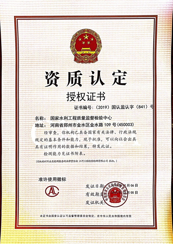 我國172項(xiàng)節(jié)水供水重大水利工程已開工建設(shè)130項(xiàng)余項(xiàng),水利建設(shè)快速發(fā)展的同時,如何維護(hù)水利工程的健康穩(wěn)定,保障建設(shè)質(zhì)量,成為亟待解決的問題。水利部提出了"水利工程補(bǔ)短板、水利行業(yè)強(qiáng)監(jiān)管"的新時期水利改革發(fā)展總基調(diào),公司積極響應(yīng)貫徹總基調(diào),高屋建瓴、胸懷行業(yè)大局,找準(zhǔn)定位、謀劃未來發(fā)展,擔(dān)當(dāng)社會責(zé)任,以前瞻性眼光進(jìn)行策劃,于2018年8月份向市場監(jiān)管總局提出了籌建國家級質(zhì)量監(jiān)督檢驗(yàn)中心的申請。在國家市場監(jiān)督管理總局的監(jiān)督指導(dǎo)下,在河南省人民政府和水利部、黃河水利委員會的關(guān)心支持下,歷時一年半的時間,經(jīng)過總局領(lǐng)導(dǎo)現(xiàn)場查勘、國家級專家論證會、國家級評審專家現(xiàn)場評審等環(huán)節(jié),終于在12月6日獲得國家水利工程質(zhì)量監(jiān)督檢驗(yàn)中心的授權(quán)證書和資質(zhì)認(rèn)定證書。